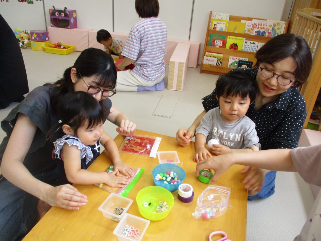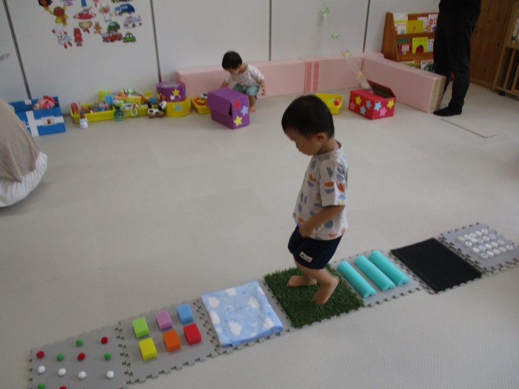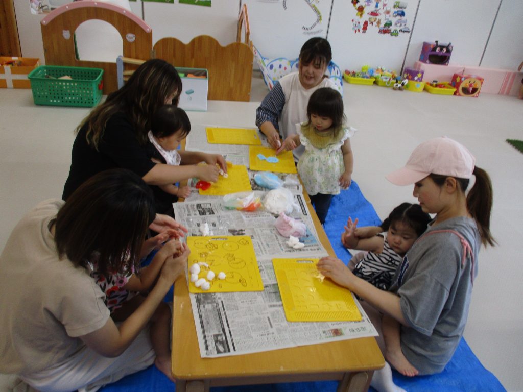 洗濯のりやビーズなどを使ったセンサリーバック制作、足の裏でいろいろな感触を楽しむセンサリーマット遊び、片栗粉粘土など様々な感触を親子で楽しむ様子が見られました☺